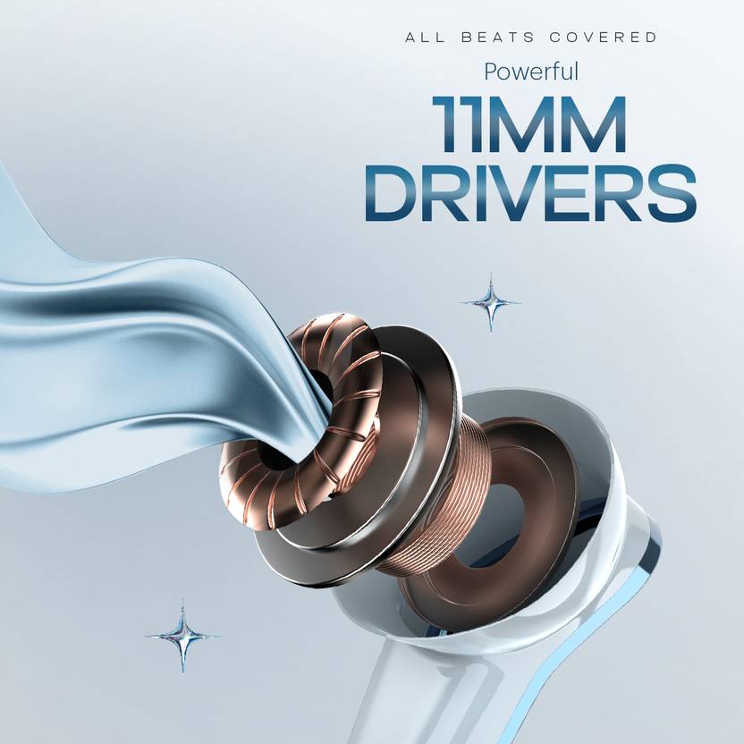 Presenting Buds . It comes with a premium finish and is feature-packed with 50 hours of playtime. It upholds every rhythm, keeps you connected to your music, and calls for a long time. With quad mics featuring ENC, experience the flow of smooth conversations and a clear voice even in a chaotic environment.
